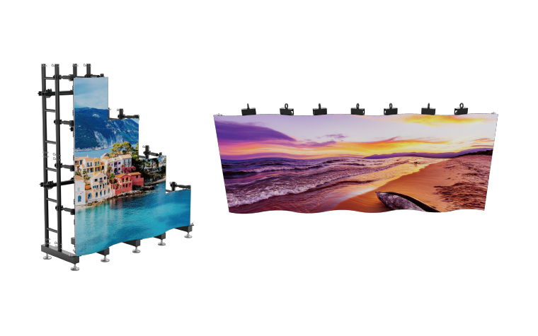 ⑥ 吊裝堆裝皆可,曲線依然:FL系列設(shè)計了小巧靈活的吊裝塊配件,以及前端帶有獨立連接片的專用配套支撐架配件,完美適配各種造型的弧形屏體安裝需求。